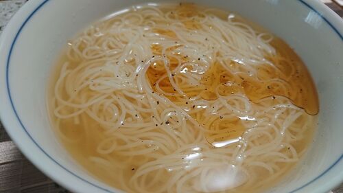 昨日の夜に、こちらの方のツイートを見て、私も作ってしまいました。 これはおかわり無限ループいける…素麺だけどもはやラーメン。素麺で【塩ラーメン】ほんとこれ食べてみてほしい。めちゃ簡単でまじ旨い。水200ml、顆粒鶏ガラ大さじ1/2弱、3倍濃縮麺つゆ小…